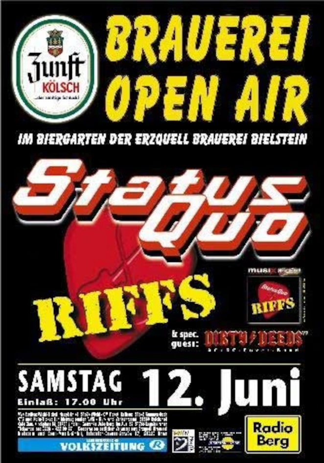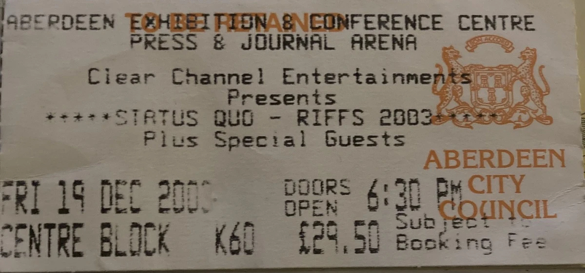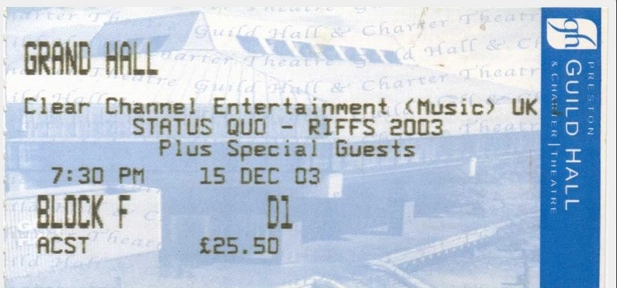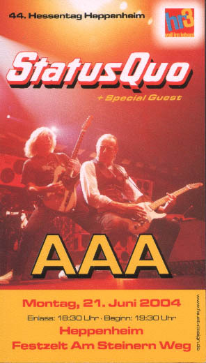 10.09.2004 - Quo were one of a number of major artists to play a special show to mark the opening of the recently-renovated Zürich airport in Switzerland. This unique gig was performed inside an aircraft hangar to a crowd of over 10000. The Quo set was around 70 minutes, with no change to the recent setlist but without the 'Heavy Traffic' songs and no "Big Fat Mama".