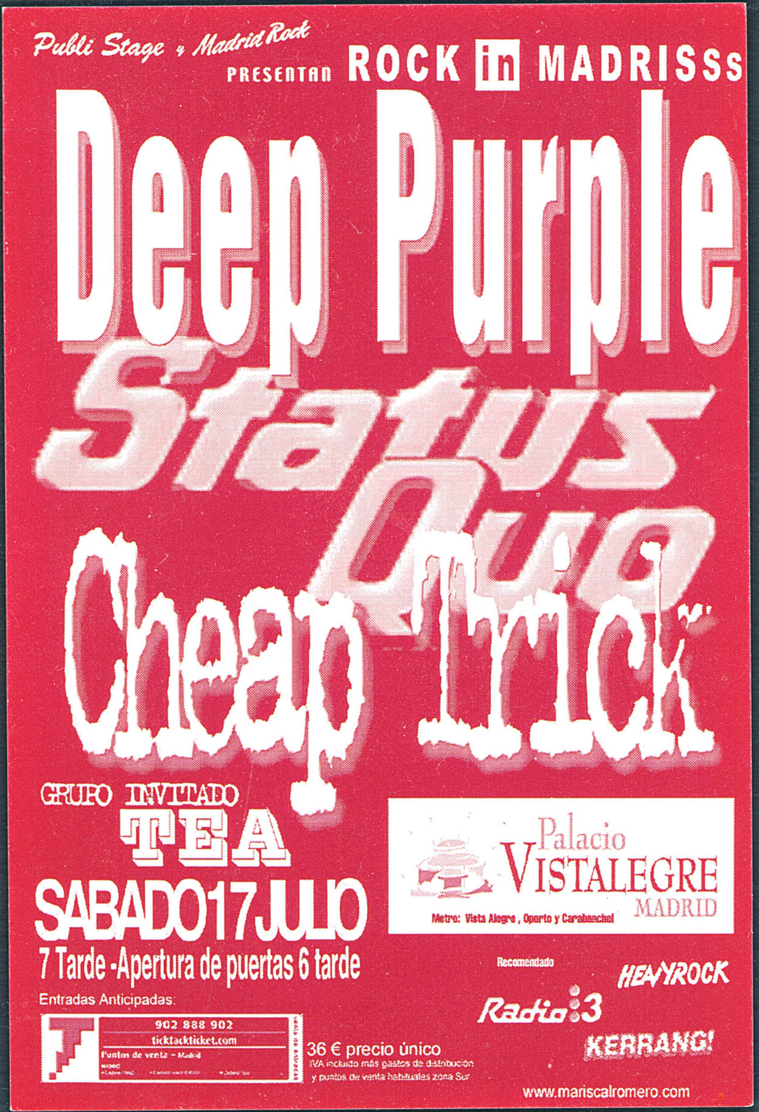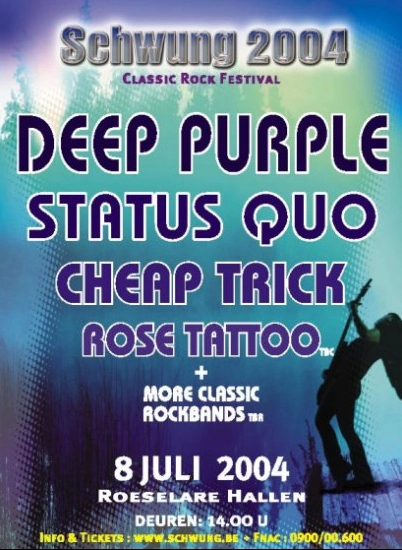 Support Bands: Who's That Girl (UK and Germany), Karntaka, Brendan Keane (Ireland), Midnight Blues (Denmark), the Hamsters*, Toothpaste Factory** (Summer UK) and Status Quo supported Deep Purple on some Festival shows during the summer.