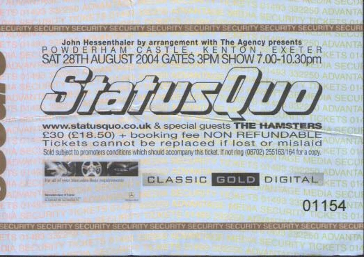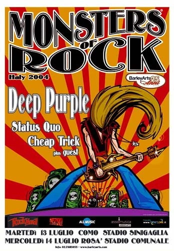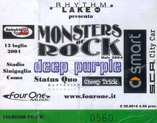 13.07.2004 - Quo's first gig in Italy since 1981, Quo played on the shores of Lake Como at yet another of the Monsters of Rock festivals. They kicked off with "Caroline" and, with Francis' mike out of action, vocals were performed by Rick and Francis singing into the same mike! Another italian gig in Padova the next day was cancelled by the promoter.