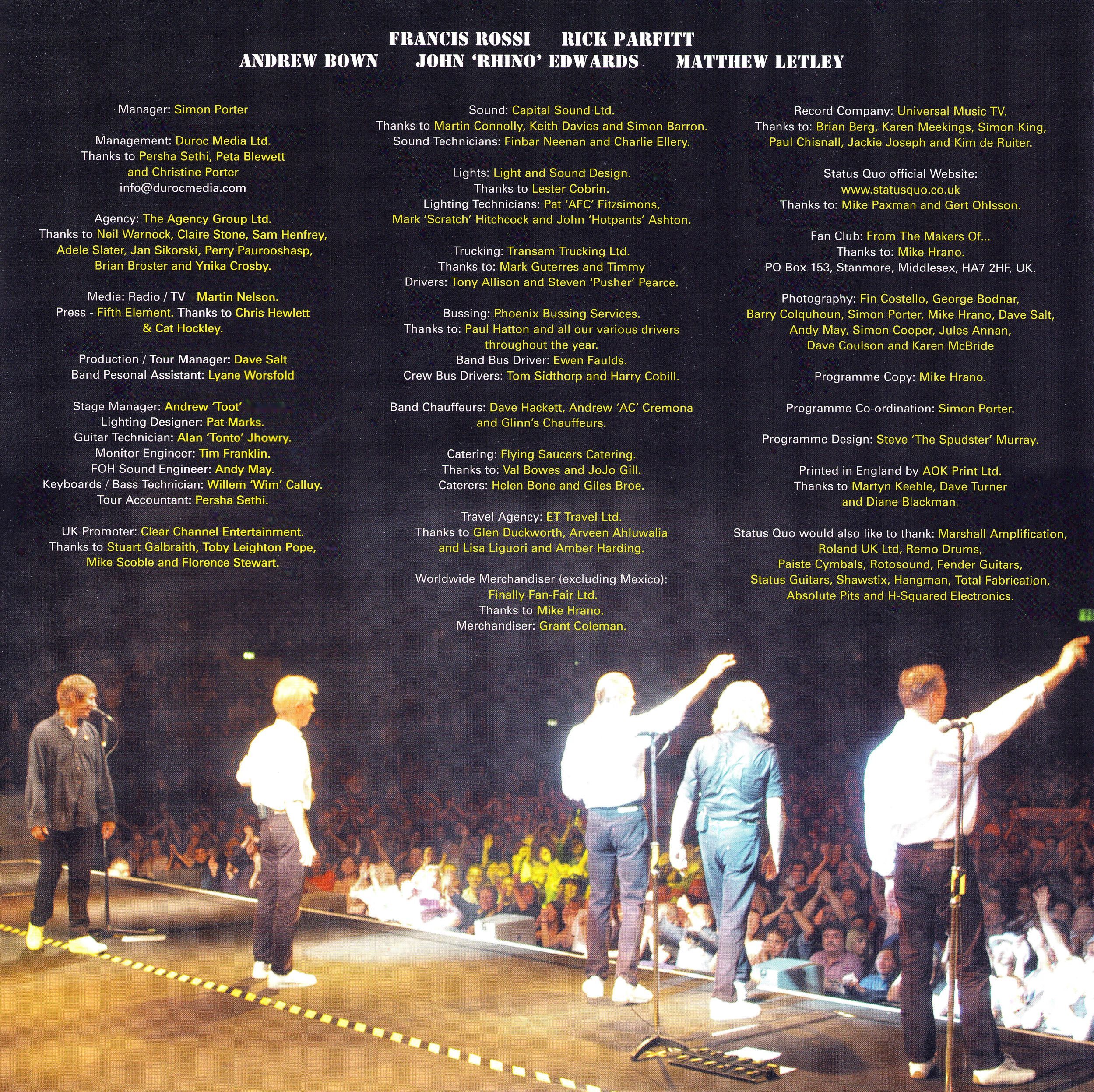 Band members: Francis Rossi, Rick Parfitt, Andy Bown, John Rhino Edwards, Matt Letley