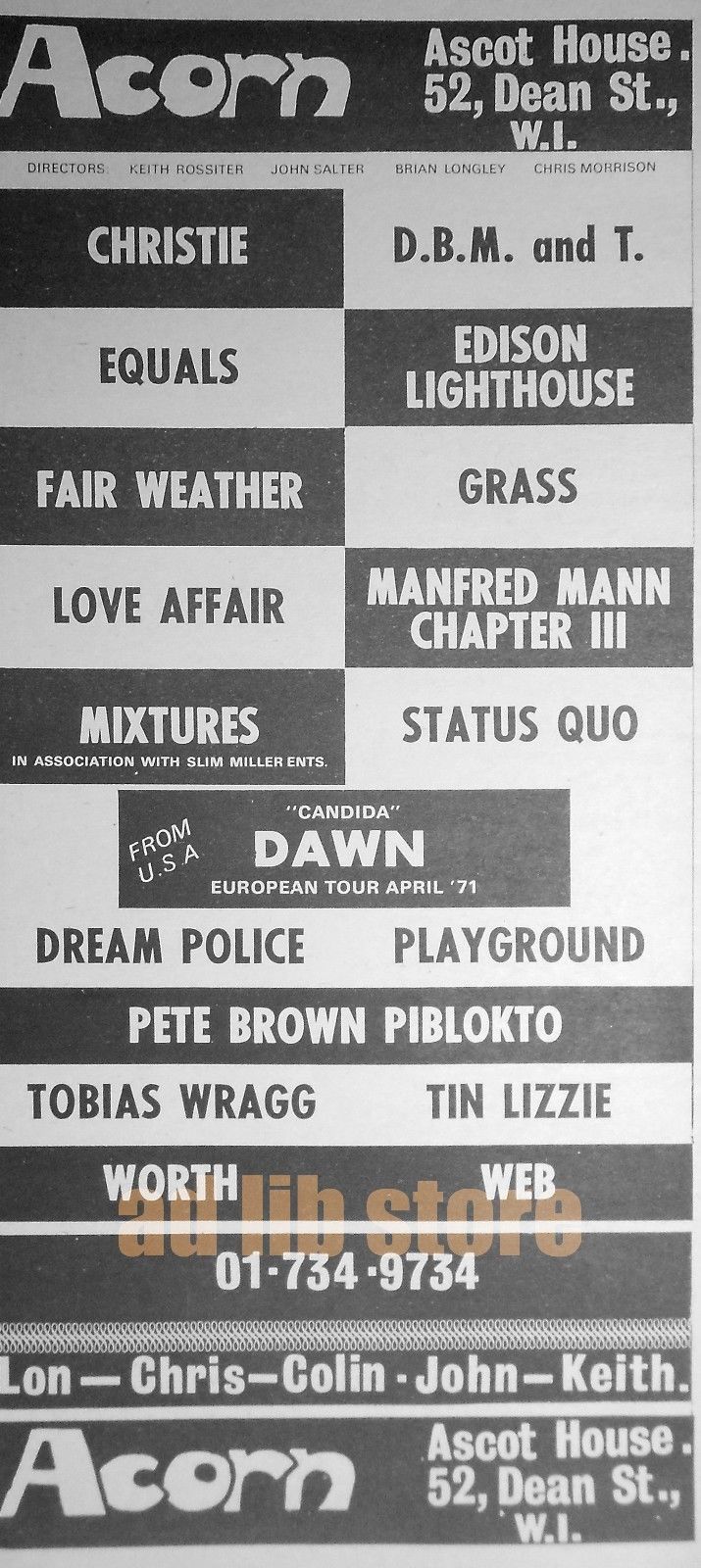 Tour Crew: Bob Young (Tour Manager), Mal Kingsnorth (Sound engineer/Stage Equipment), Paul Robert Lodge (Roadie/Equipment). Management: Acron Artists, Gaff-Masters Management (mid 1972) Manager: Colin Johnson, Billy Gaff