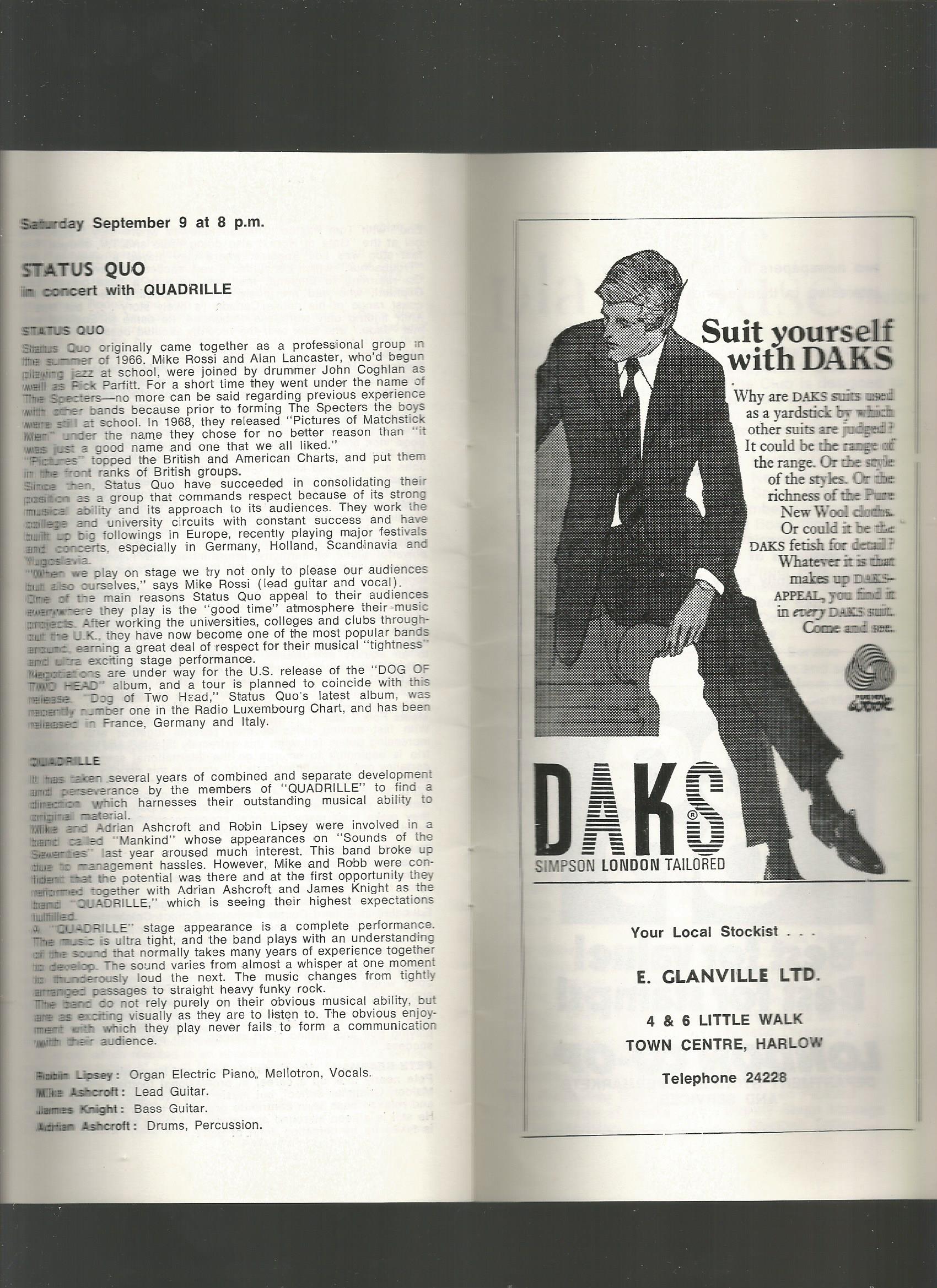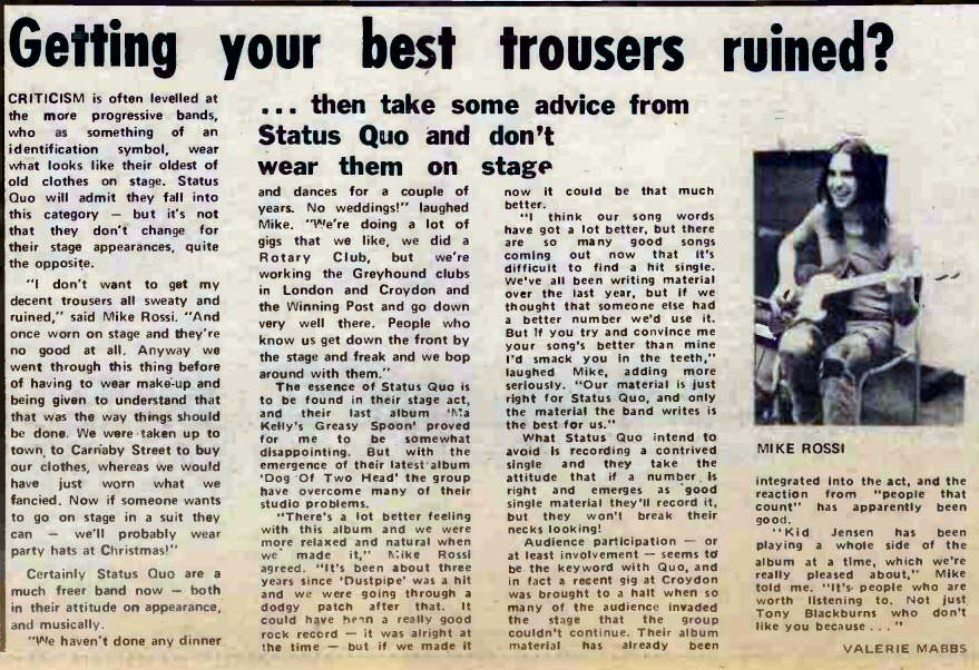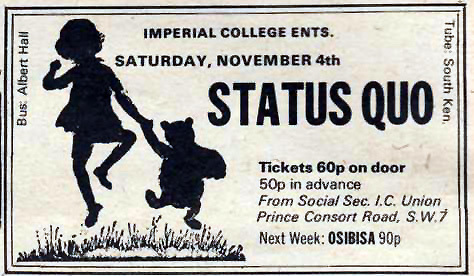 10.05.1972 - a small UK tour supporting top glam artists of the day, Slade, would help Quo secure a deal to tour with the band in Australia in 1973. the publicity that Quo got during that tour earned them a fond place in the Aussie hearts and resulted in regular further tours down under.