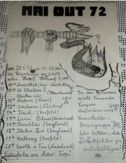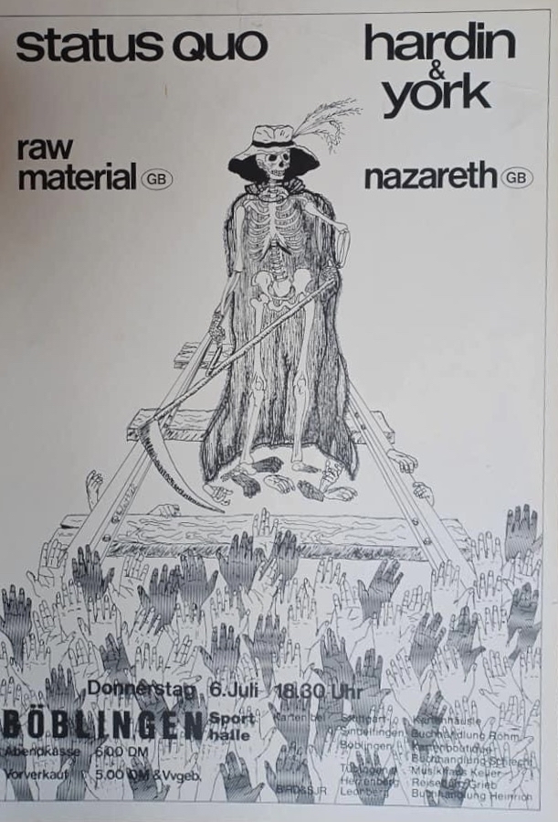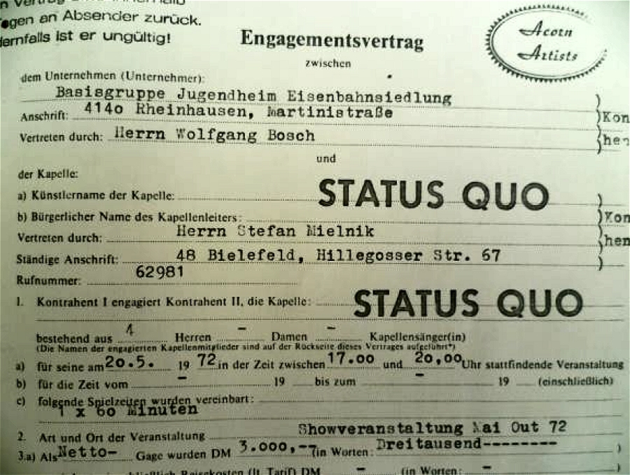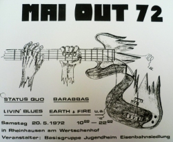20.05.1972 - Quo appeared at two German Festivals: one at Rheinhausen's May-Out Festival (20.5.) and the other one at the big Germersheim-Pfalz Insel Grün Festival in Germany along famous acts like The Faces, The Kinks, Rory Gallagher, Savoy Brown, Nazareth, Billy Joel and many others (22.5.) In 2024, SWR broadcast a TV documentary entitled “Das Deutsche Woodstock”, in which Francis also reports in detail about the festival and there are also clips of Quo's 2022 performance included at the Mercedes-Benz Global Logistics Center in Germersheim to mark the 50th anniversary.