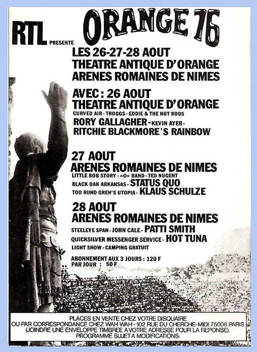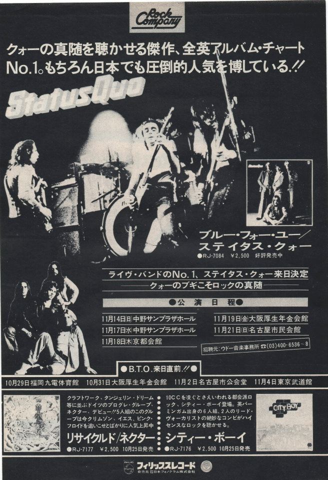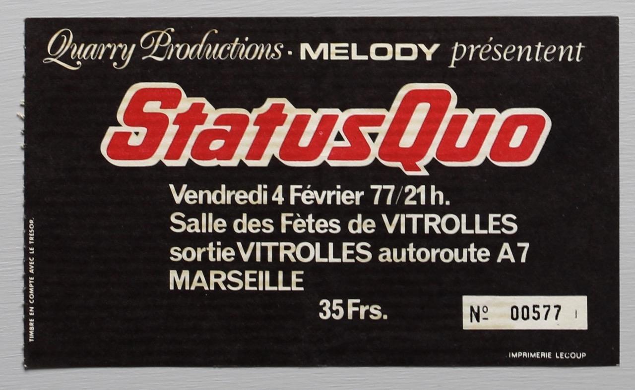 Tour Notes: Their last US Tour in the 70's supporting bands like Wishbone Ash, Peter Frampton, Fleetwood Mac, Ted Nugent, Gary Wright, Slade and Foghat. During the recording of the LIVE Double Album at Glasgow Apollo Theatre  27.-29.10.1976, Andrew Bown  (Keyboards) starting to work with the band for the first time on stage. The French Festival  Orange'76 at Arenes Romaines de Nimes (with Quo, Rory Gallagher, Patti Smith) on 27th of August 1976, Rennes 3/2/77 and Toulouse 7/2/77 were cancelled.