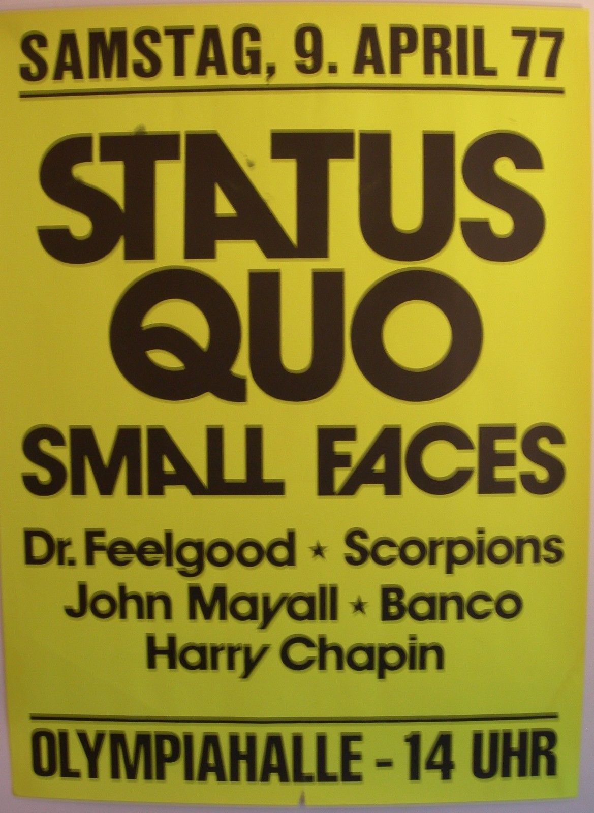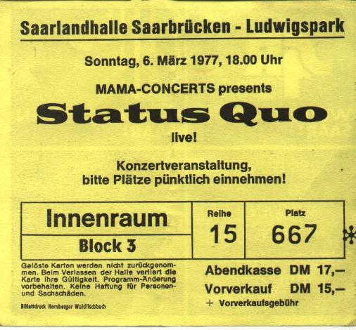 09.04.1977 - Quo were headliner at the sold out Great Easter Rock 'n' Blues Express Festival in München and Dortmund, Germany. The line-up at both nights were: Status Quo, The Small Faces, Scorpions, Dr Feelgood, John Mayall and Harry Chapin. Mama Concerts organized this special event for Quo, to promote the release of the famous Glasgow LIVE Album in Germany.