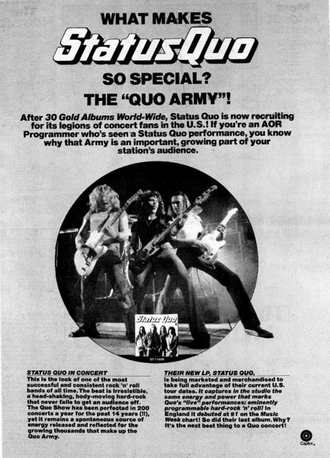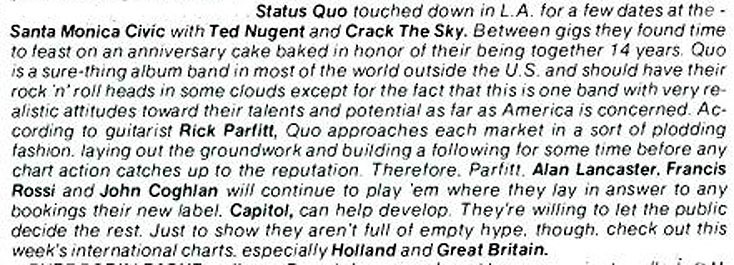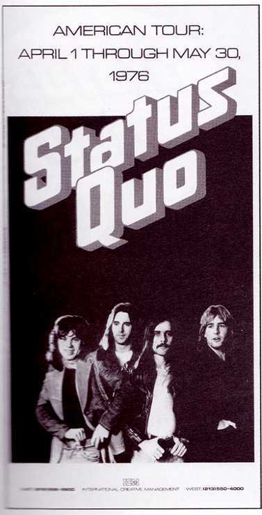 30.03.1976 - Quo started their last USA tour in the glory 70's at Philadelphia, supporting Robin Trower. The band did a few gigs on their own and lots of shows/festivals in huge US Arenas and Stadiums - supporting acts like Fleetwood Mac, Ted Nugent, Robin Trower,Gary Wright, Wishbone Ash and Peter Frampton. In Oakland Quo started the "British are Back Festival in front of 57.000 rockfans. All US tourdates are taken from US Billboard magazines.