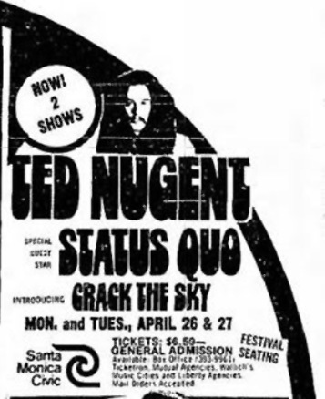 27/04/  USA, Santa Monica - Civic Auditorium (support to Ted Nugent, Crack the Sky)
