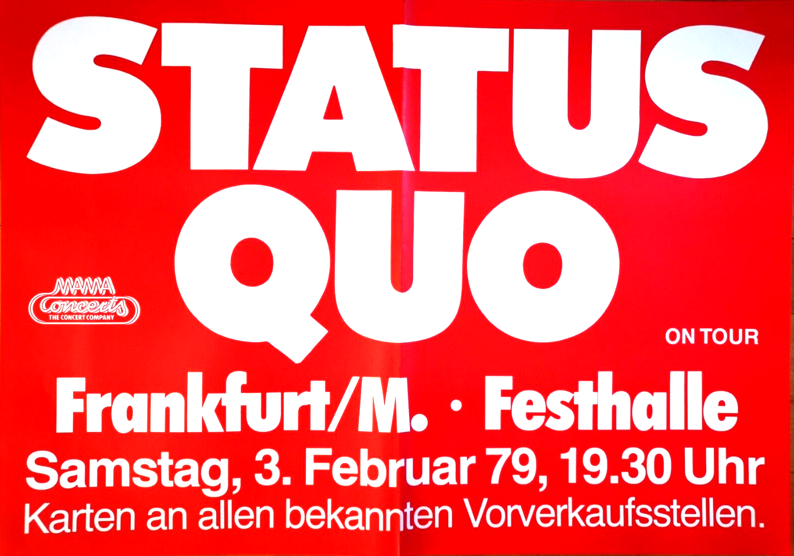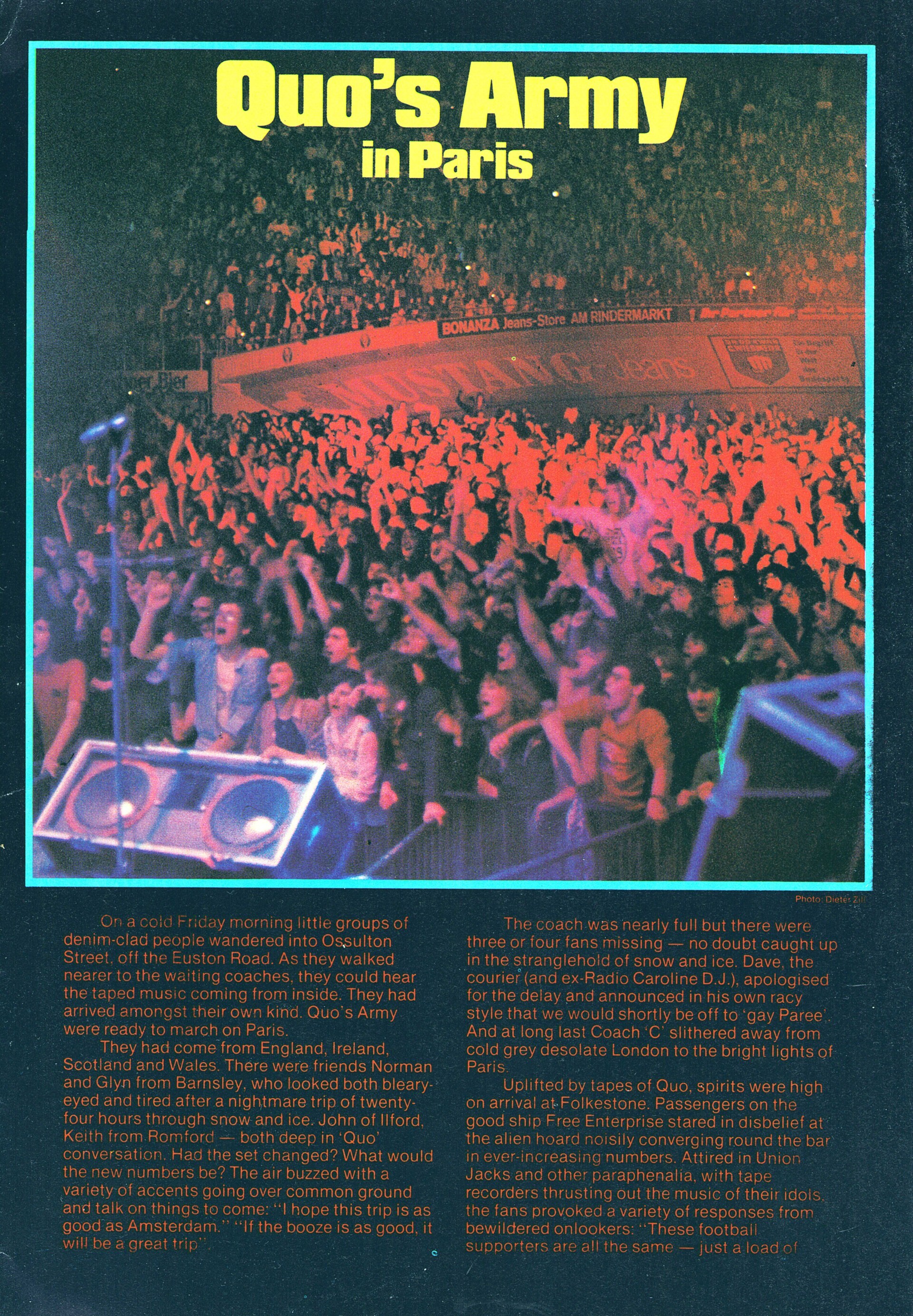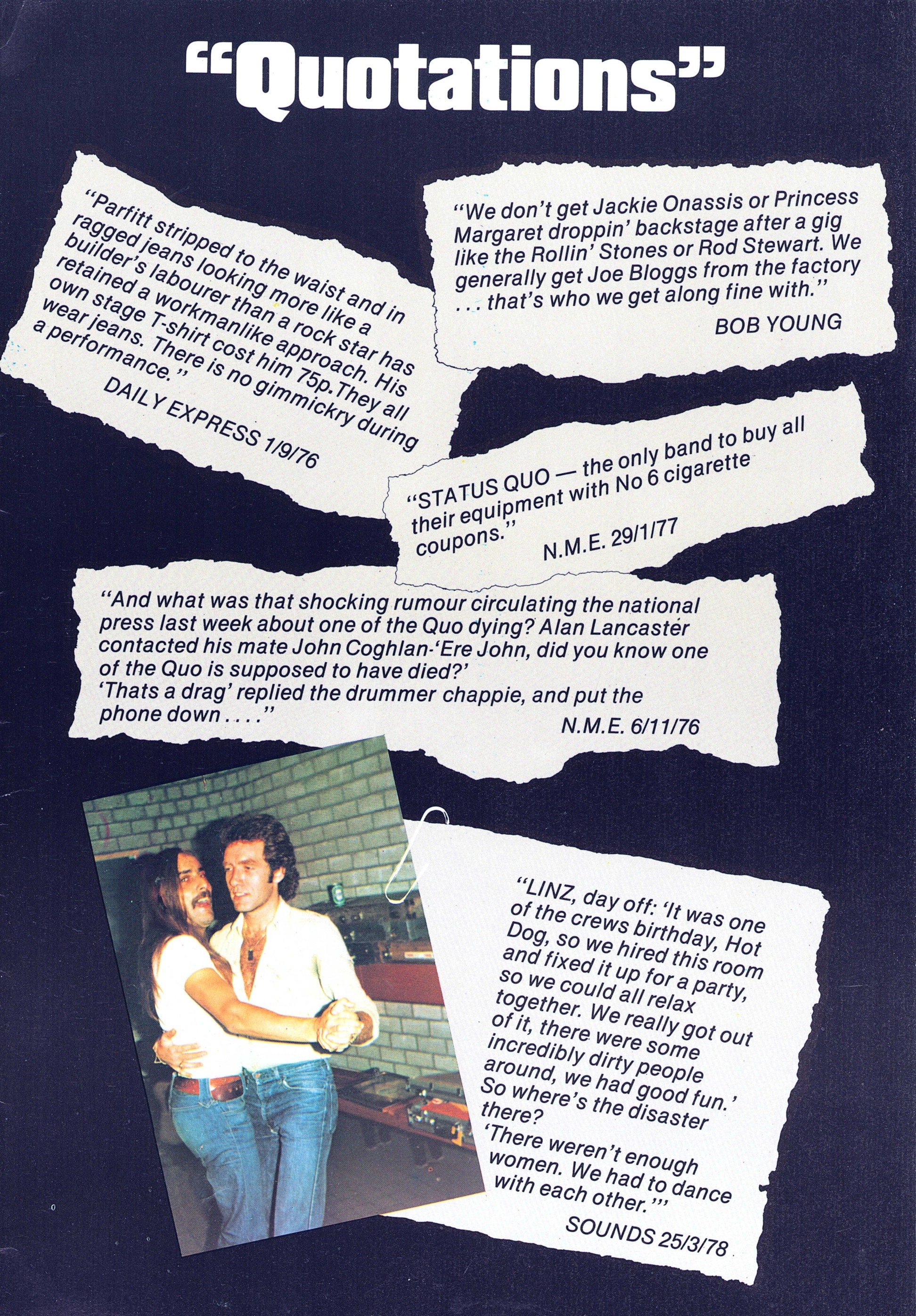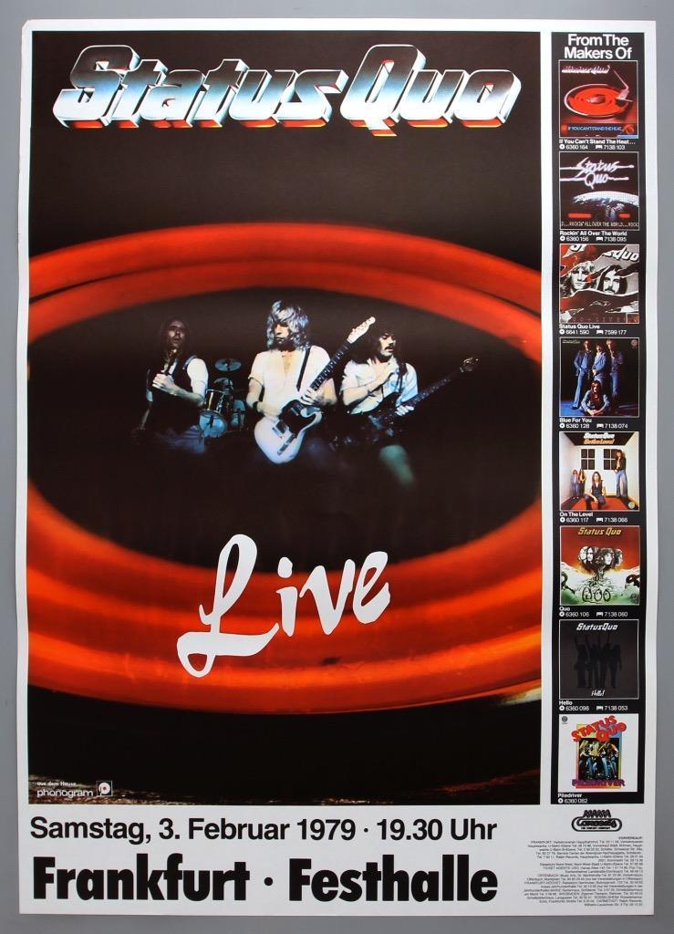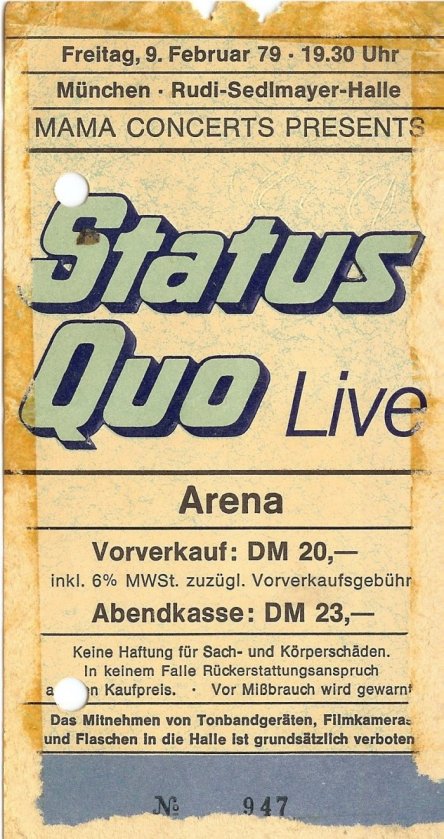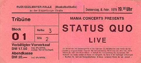 Francis falls brutally to the rear and impacts hard on the monitor loudspeaker at the stage ramp. Francis lies on the stage without any movement. Aides hurry up and try to help him up on his feet. In vain. Francis does not come up. Meanwhile Rick, Alan, John and Andy continue to play. But they stopped when 2 doctors ran on stage. A terrible disorder on the stage, a short discussion: then Francis Rossi was carried away. The fans are shocked, some have tears in the eyes. One quarter of an hour passes. In prevails dead silence resounds. Everyone waits for an explanation whether the popular Quo guitarist injured itself seriously. But then Status Quo came back on the stage much to the surprise of the audience. And Francis participates. With the help of syringes, the Quo guitarist fights itself over the rounds. Immovably the hard professional, who otherwise would jump to the hammer volume of the rhythm like a "jump-in-the-field , stands there and his sweatful face can't hide his pain. The fans honored Francis inhuman efforts with applause lasting several minutes. That leads to the fact that Status Quo gave three encores! One hour later in the hotel. Worried people here and there, still the shock is everywhere in all faces. " The whole thing was simply very unlucky" , explains Rick Parfitt. "Everyone of us guitarists felt already several times, without injuring ourselves. Therefore we also carried on playing today, the thing with Francis seemed harmlessly to us . We couldn't know that he hurt himself so badly." Francis Rossi laid on soft chair. " I must go to bed." he explains. " I am fully slammed on the coccyx after my fall. I could not move genuinly any longer, the pain was cruel. My back is now still full of pain. I hope, the thing heal fast. It makes no fun for me, to stand on stage without moving." Before the Status Quo guitarist disappears, he means " I must thank all the fans. They were fantastic, perhaps somewhere else the people would have whistled, but not in Germany.