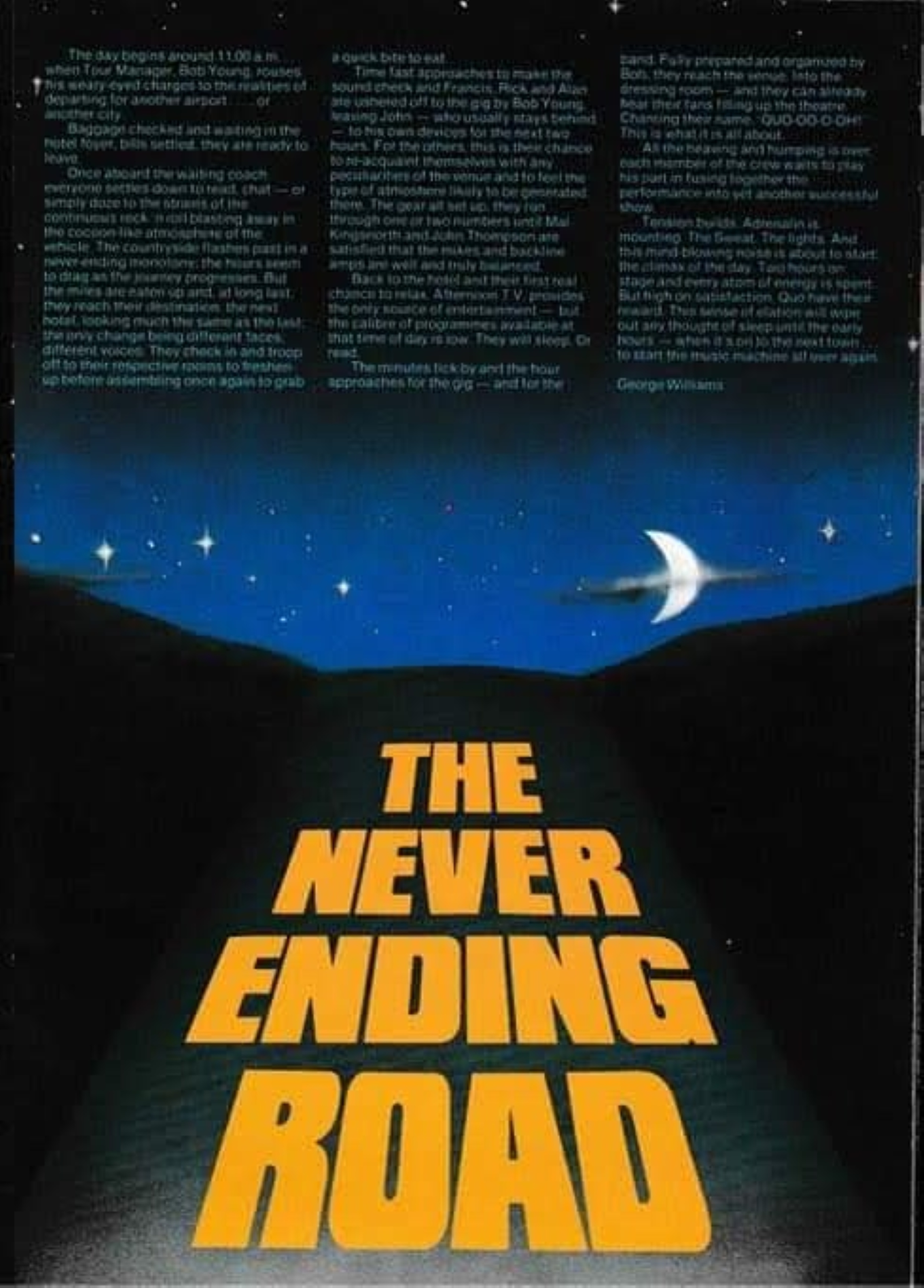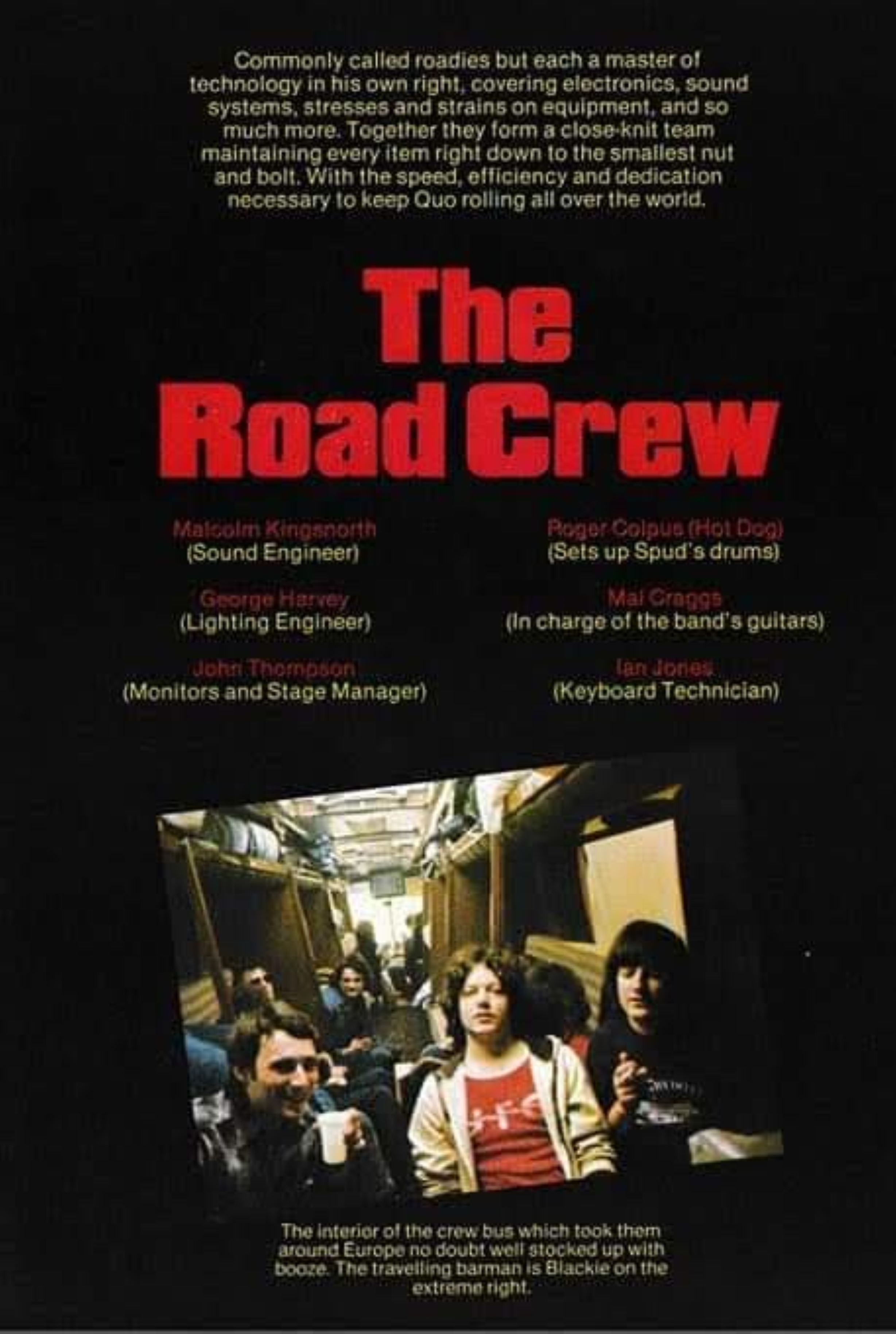 Tour Crew: Bob Young (Tour Manager), John Thompson (Stage Manager), Mal Kingsnorth (Sound engineer), George Harvey (Lightning engineer), Tana Douglas (Lightning roadie), Mal Graggs (Guitar tech), Roger Colpus (drum tech), Ian Jones (Keyboard tec), Jim McAndrew (Band Transportation). Management: Quarry Production. Manager: Colin Johnson, Alan Crux. Tour Merchandiser: Status Quo Merchandise/Bravado.