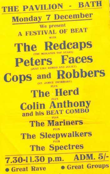 The Spectres first ever live performance took place in October 1962 at the Samuel Jones Sports Club, on Lordship Lane in Dulwich. The band would then perform on a regular basis at this venue until one night a local gas fitter named Pat Barlow offered to manage the band. By the middle of 1963 and throughout 1964 Pat Barlow booked shows in other venues around South East & Central London. By this time the band were all still at school and rarely giged during the working day. B UT...early accurate gig dates are very tricky to find because there were 8 different bands called the Spectres (or similar) in the mid 1960s operating around the UK.