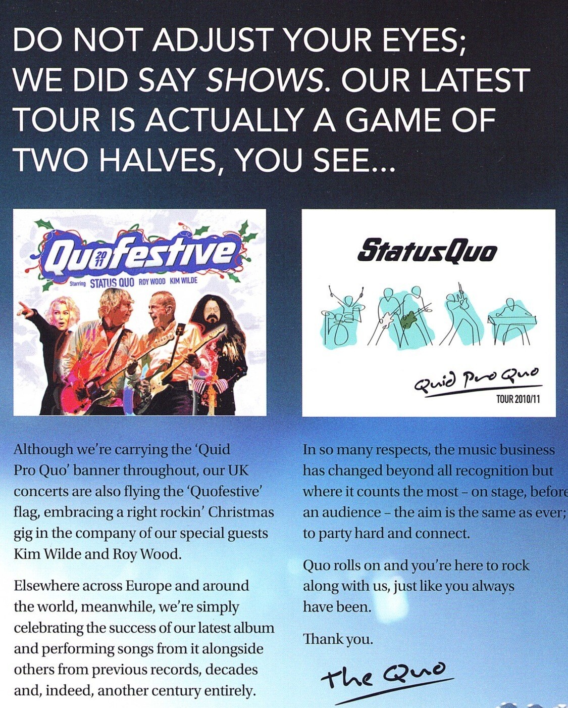 Tour Note: It seems the band will slow down a bit and played "only" a 11-date UK Arena Tour this time with special guests Kim Wilde and Roy Wood. No real changes in the set but a grand finale with Kim and Roy singing "Winter Wonderland" and "Santa Claus is coming to Town" together with Quo. No Bye Bye Johnny at the end...!