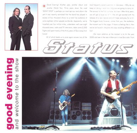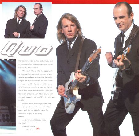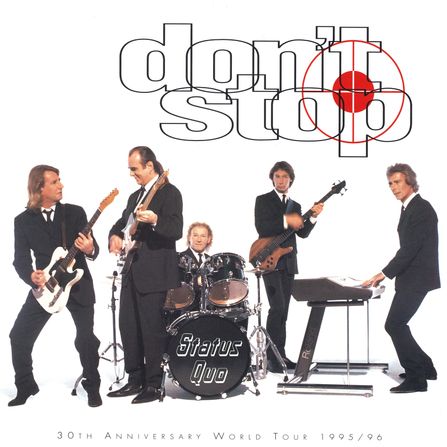 27.11.1995 - Status Quo kicked off their annual UK-Tour in Manchester which was called "Don't Stop". It's the name of the covers album which was due to be out in February 1996 and the tour name should say "(please) Don't Stop Status Quo after 30 years". Until December 17 the band played 18 shows. Special guest are "Dear John".