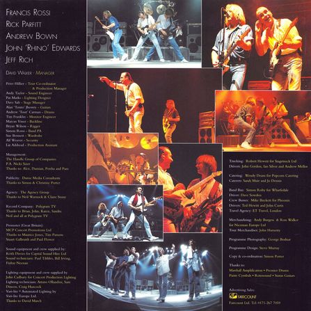 Tour Crew: Peter Hillier (Tour Manager), Andy Taylor (Sound Engineer), Dave Salt (Stage Manager/Bass Tech), Simon Rossi (Band Personal Assistant), Andrew Carman (Drum Tech), Pat Marks (Lightning Designer), Tim Franklin (Monitor Engineer), Alan "Tonto" Jhowry (Guitar Tech), Bryan Wilson (Rigger), Marcus Viner (Backline), Sue Bennett (Wardrobe), Alf Weaver (Security) Merchandiser: Niceman Europe Ltd. Management: Handle Group of Companies Manager: David Walker.