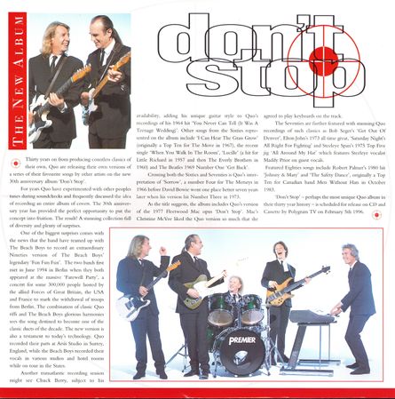 28.01.1996 - the first ever fanclub gig of the offical "From the makers of..." fanclub was held at Brixton Academy,London. Status Quo introduced the songs of the new cover-album "Don't Stop" to around 3,000 fanclub members. The songs were played playback and the show was filmed and later released on VHS video. The Beach Boys were on stage to perform their song "Fun, Fun, Fun" together with Status Quo. Brian May appeared on stage when the song "Raining in my heart" was played. After a break the band returned to stage and played a 60 minutes Status Quo live set. Again Brian May appeared on stage to perform a stunning live version of the Shadows classic hit "F.B.I." in the encore.