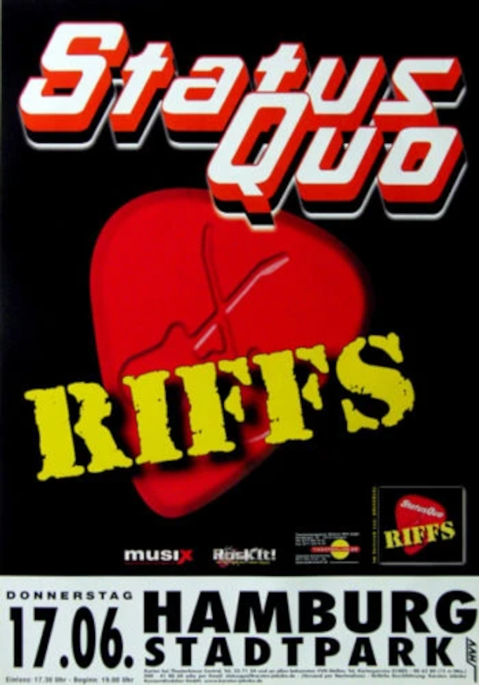 10.09.2004 - Quo were one of a number of major artists to play a special show to mark the opening of the recently-renovated Zürich airport in Switzerland. This unique gig was performed inside an aircraft hangar to a crowd of over 10000. The Quo set was around 70 minutes, with no change to the recent setlist but without the 'Heavy Traffic' songs and no "Big Fat Mama".