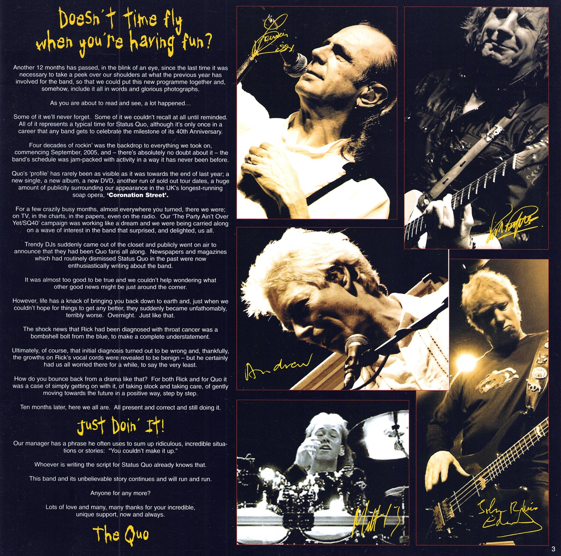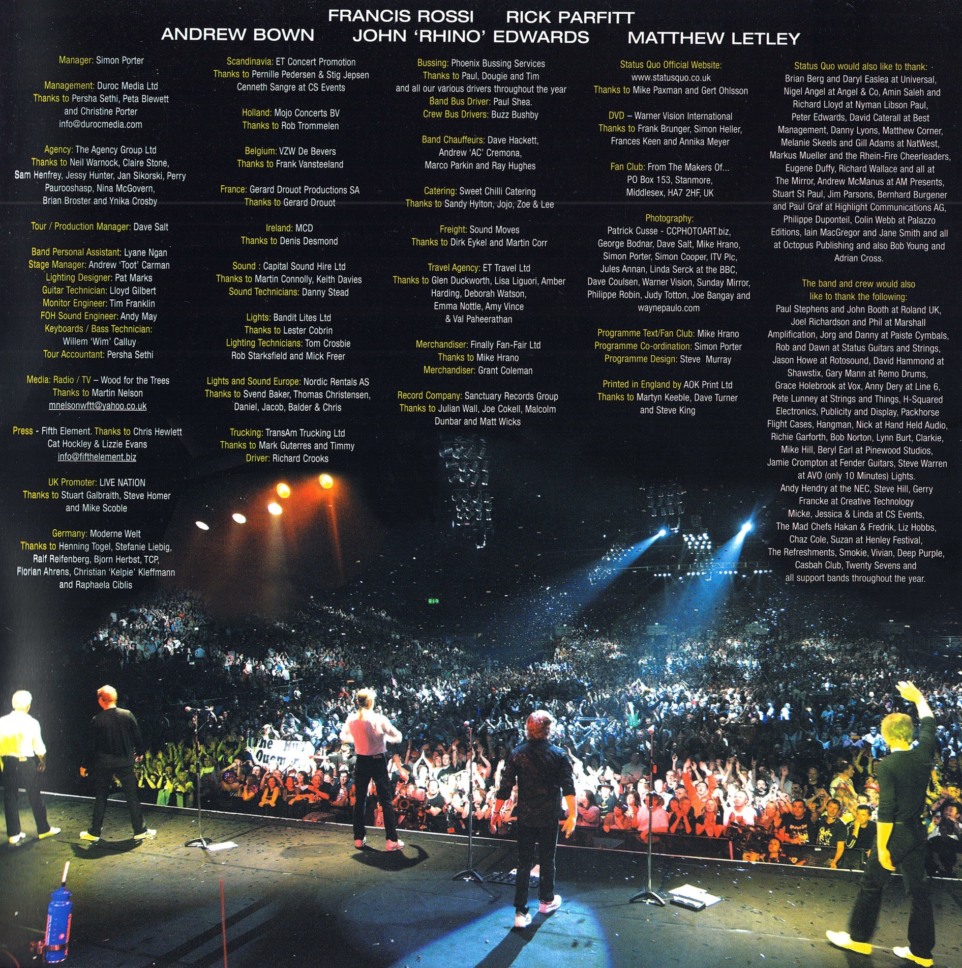 Main Setlist: Caroline, Somethin'bout you baby I Like, Don't waste my Time, 4500 Times,Rain, Paper Plane, All Stand Up, The Oriental, Creepin' up on you, Proposin' Medley, Big Fat Mama, Belavista Man, Gerdundula, Drum Solo Matt, Roll over lay Down, Down Down, Whatever You Want, Rockin'all over the World, In the Army Now, Mystery Medley, Junior's Wailing, Rock' n Roll Music/Bye Bye Johnny.