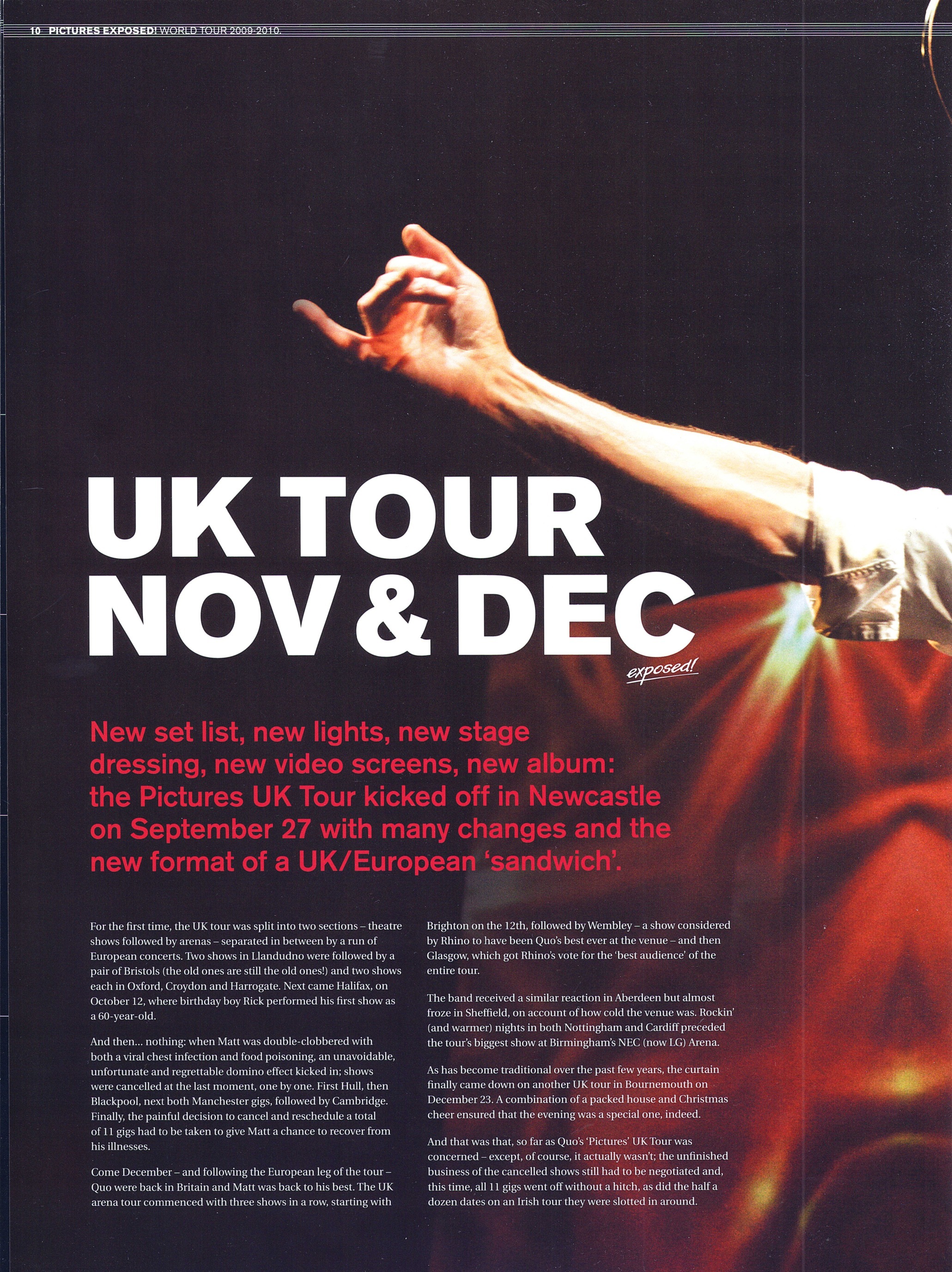 Tour Note: 9 shows were cancelled in November 2009 due to Francis Rossi's illness but only 5 rescheduled shows in early 2010 were played due to Andy's and Rick's illness.